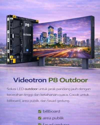 Videotron Outdoor P8 menjadi pilihan tepat untuk kebutuhan LED display luar ruangan yang mengutamakan jangkauan pandang jauh, stabilitas tampilan, dan keandalan sistem. Dengan konfigurasi yang fleksibel dan performa visual yang konsisten, seri P8 siap mendukung berbagai kebutuhan promosi dan informasi di area outdoor.
